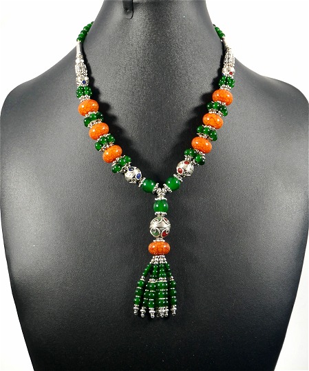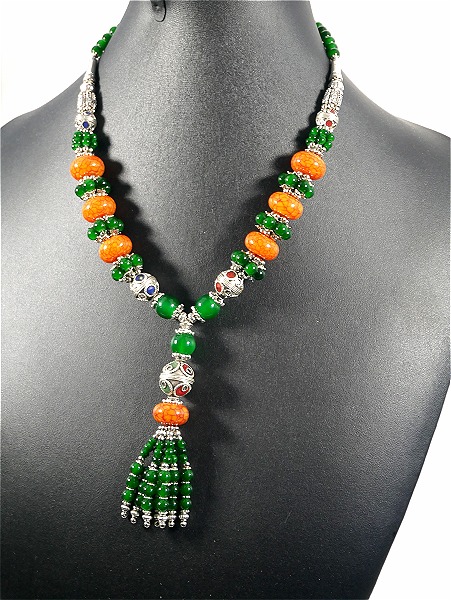 Collier ethnique artisanal avec pierres orange et vert agremente de breloques et d'armatures argentees