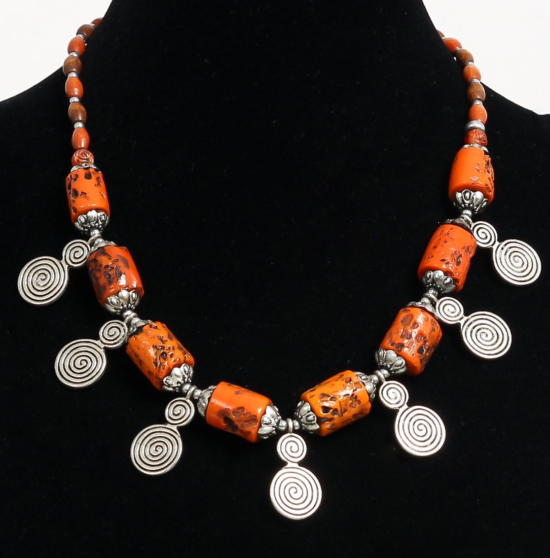 Collier ethnique artisanal cylindres imitation corail orange avec armatures en métal argenté ciselé agrémenté de pendentifs tourbillon spirale argentés Vetement & Accessoire