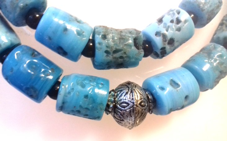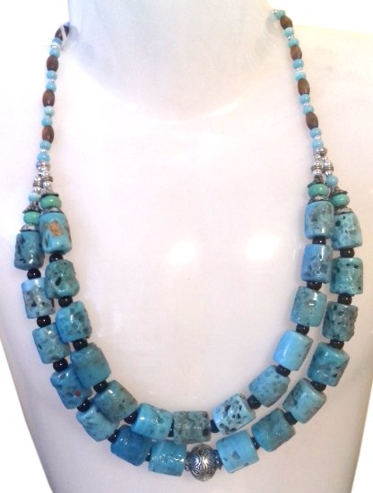 Collier ethnique artisanal deux rangs imitation pierres bleu agencées de pièces argentées ciselées - REF. 23725 (24.90 €)