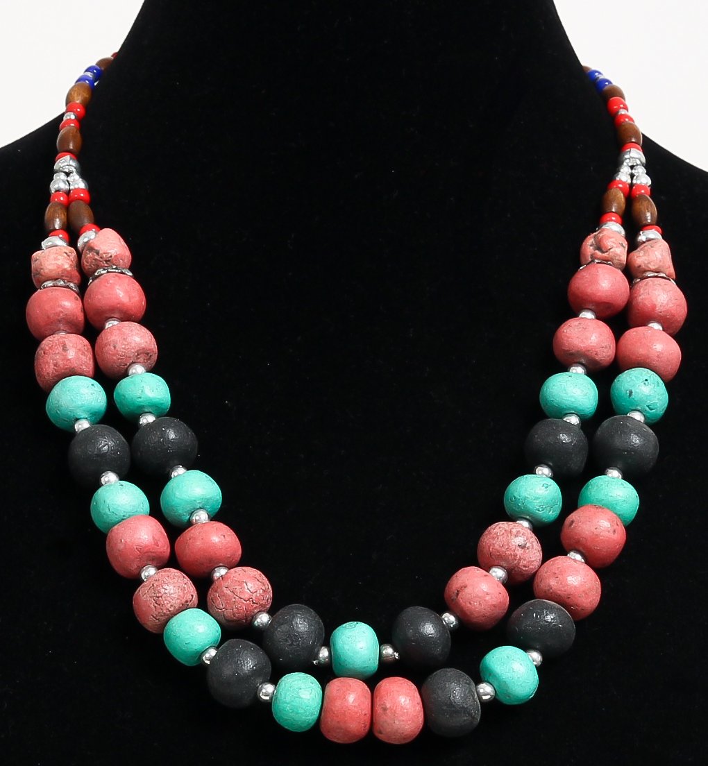 Collier ethnique artisanal deux rangs imitation pierres rondes multicolore agencées de perles argentées, rouges, bleues et en bois Vetement & Accessoire