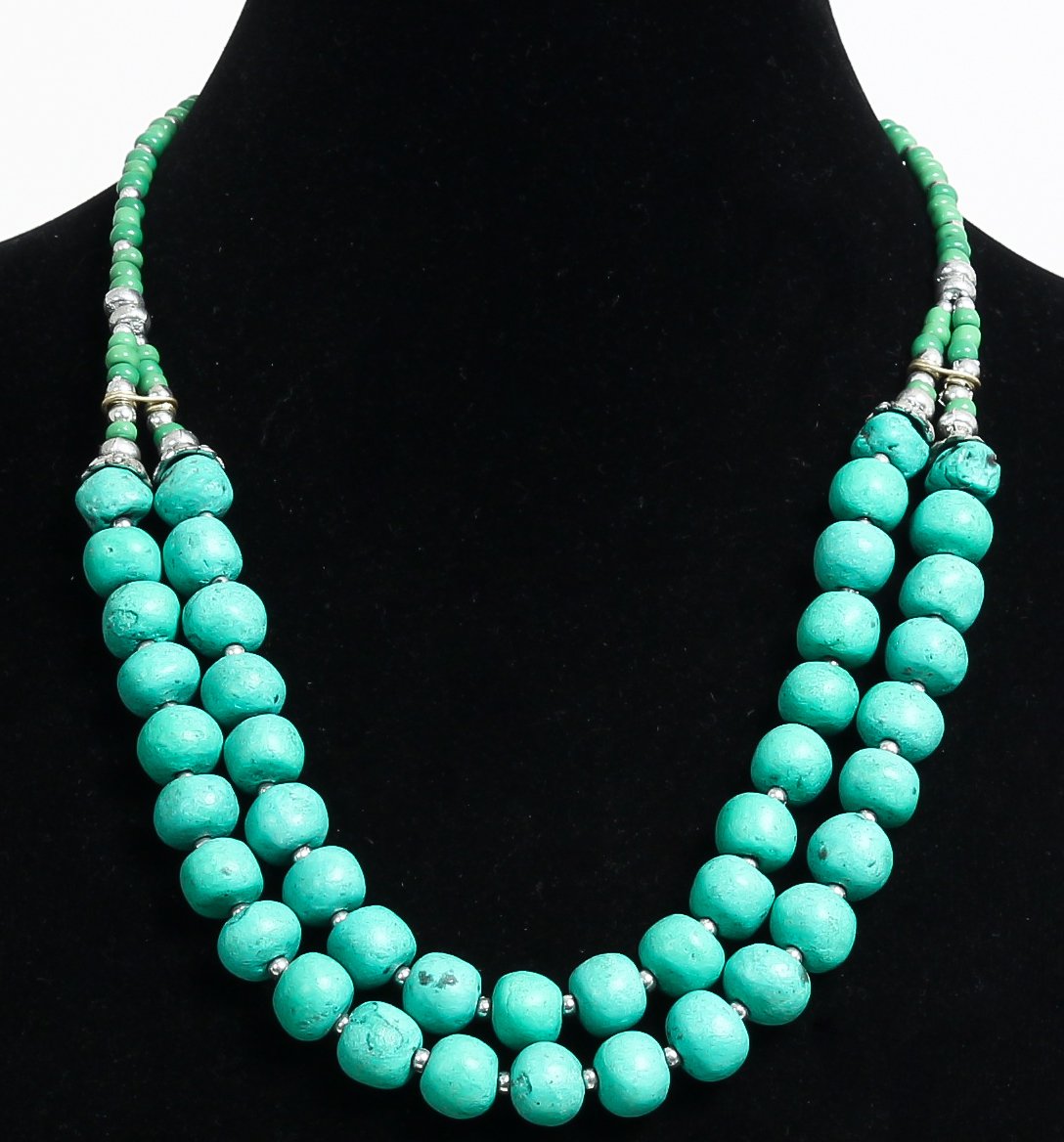 Collier ethnique artisanal deux rangs imitation pierres rondes turquoises agencées de perles vertes et argentées Vetement & Accessoire