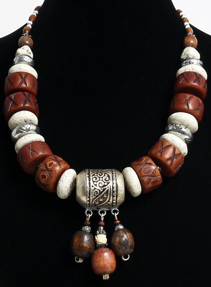 Collier ethnique artisanal disques marrons gravés et pierres blanches agrémenté de pièces argentées et breloques Vetement & Accessoire