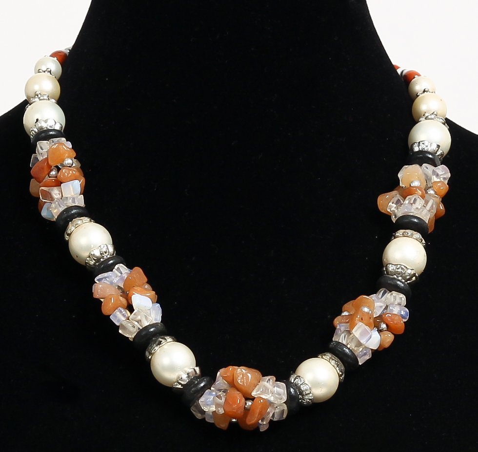 Collier ethnique artisanal imitation boules blanches agrémentées de quartz transparent et marron - REF. 19125 (22.00 €)