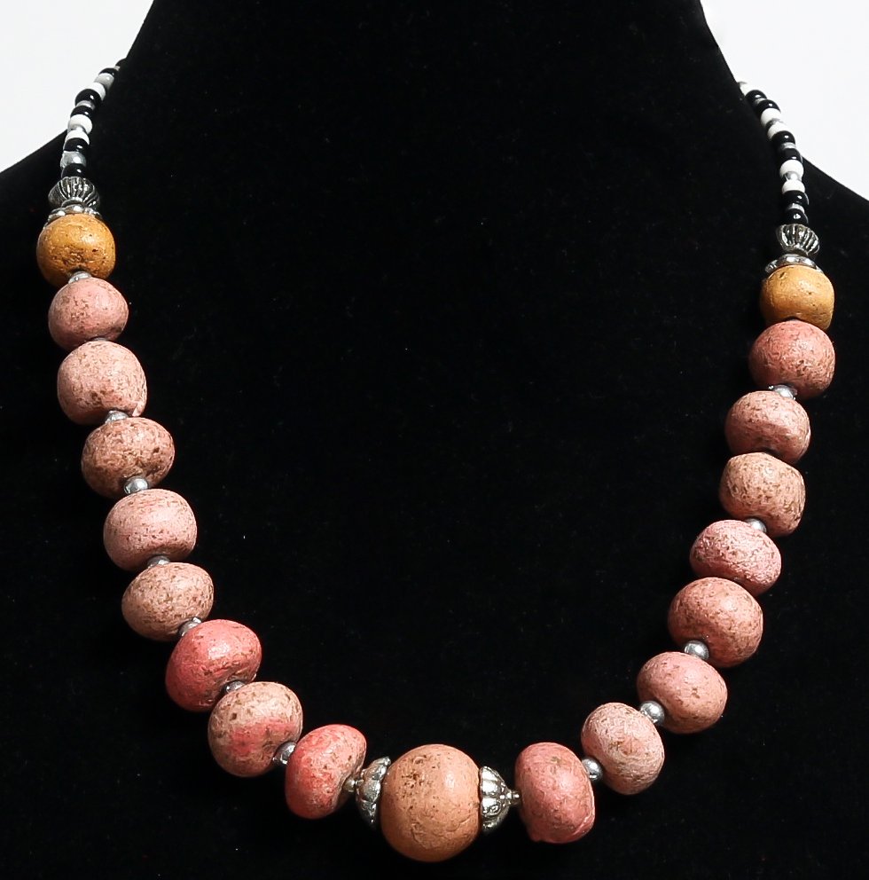 Collier ethnique artisanal imitation boules de corail rose agencées de perles argentées, noires et blanches - REF. 19065 (14.00 €)