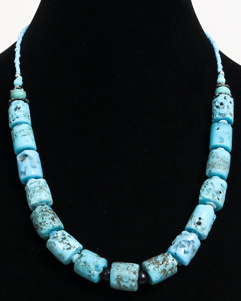 Collier ethnique artisanal imitation boules turquoises difformes séparées de perles bleues - REF. 18938 (14.00 €)