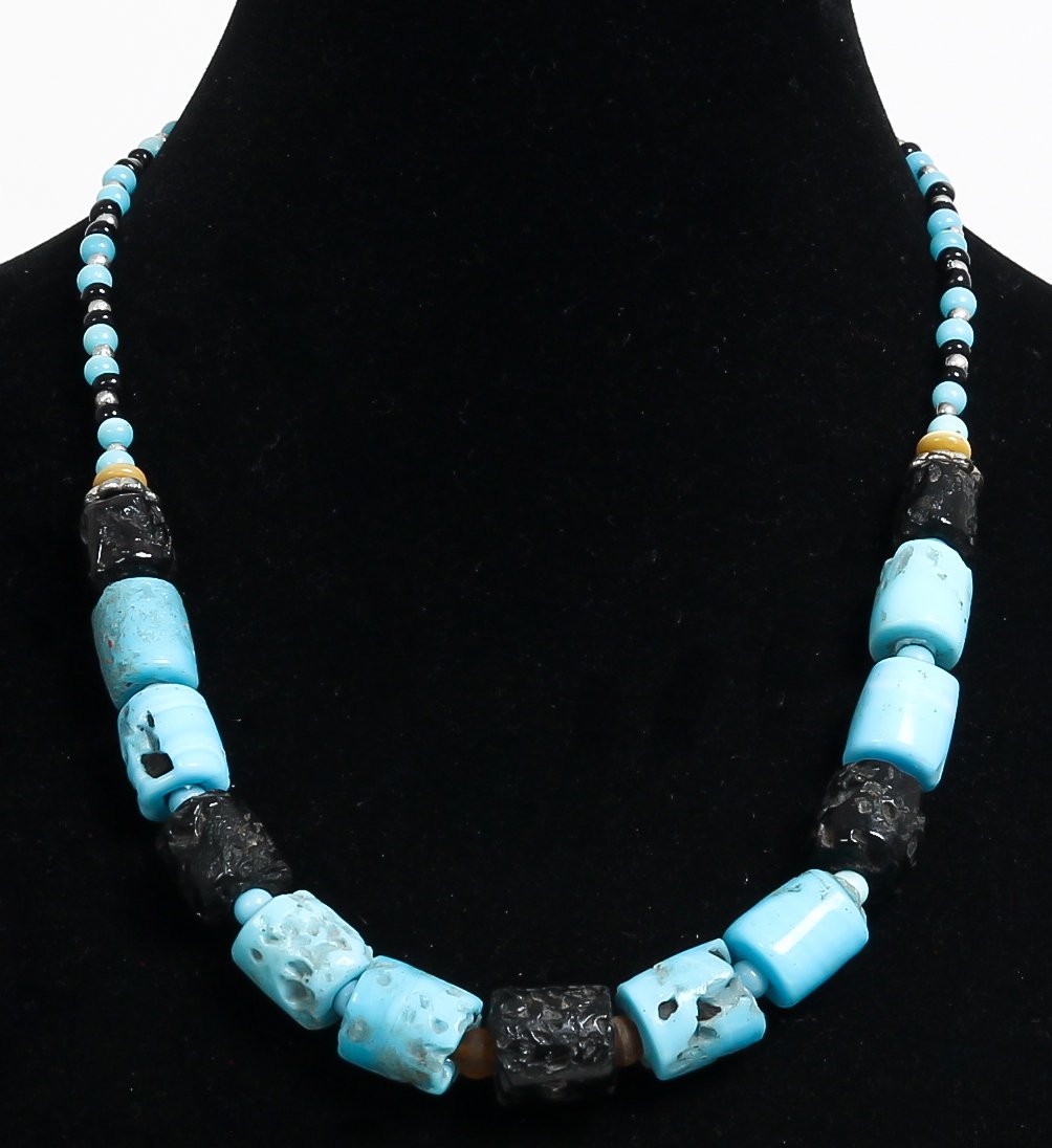 Collier ethnique artisanal imitation boules turquoises difformes séparées de perles en métal et composé d'autres perles noires et blanches - REF. 18942 (14.00 €)