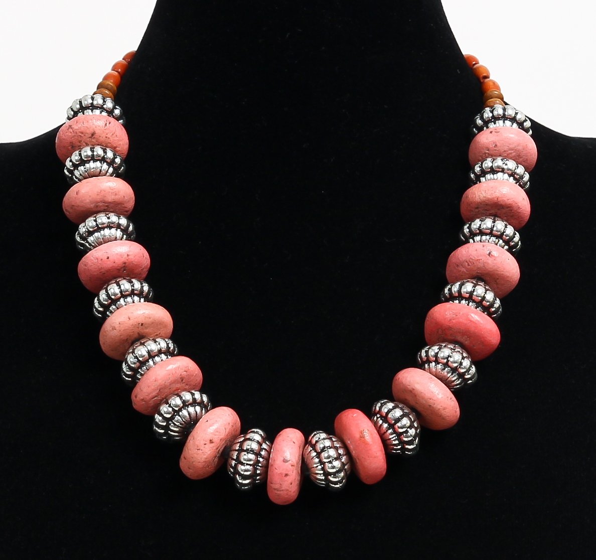 Collier ethnique artisanal imitation boules de corail rose agencées de perles argentées, noires et blanches - REF. 19065 (14.00 €)