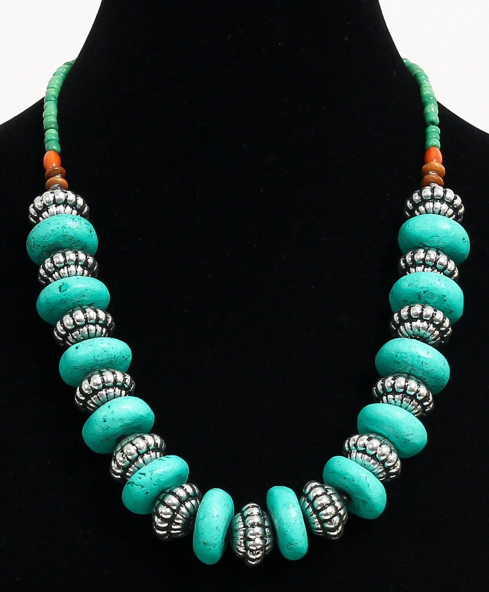 Collier ethnique artisanal imitation pierres difformes turquoises séparées de perles en métal avec une boule en métal et des perles vertes - REF. 18947 (14.00 €)