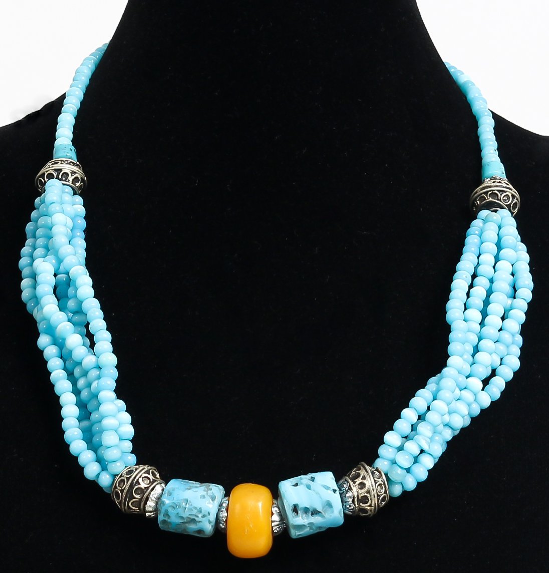 Collier ethnique artisanal imitation boules turquoises difformes séparées de perles en métal et composé d'autres perles noires et blanches - REF. 18942 (14.00 €)