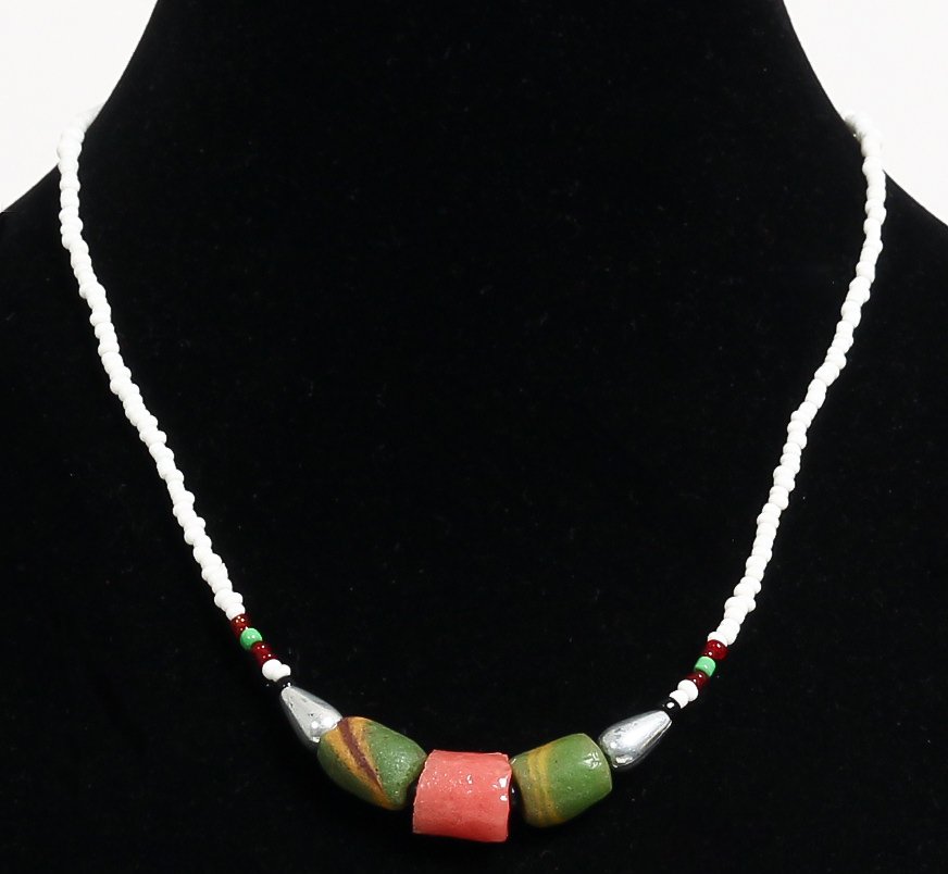 Collier ethnique artisanal imitation pierres cylindrées multicolores agencées de perles vertes et noires - REF. 19083 (22.00 €)