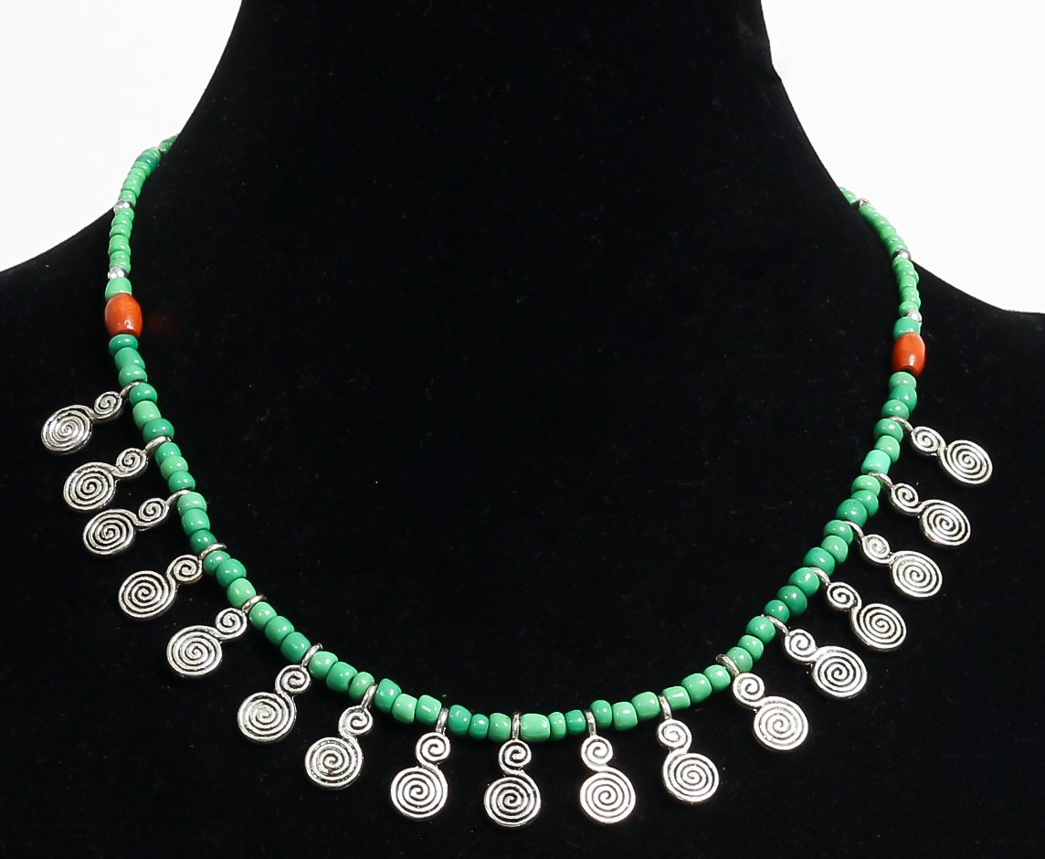Collier ethnique artisanal imitation perles vertes agrémentées de breloques en spiral en métal argenté Vetement & Accessoire