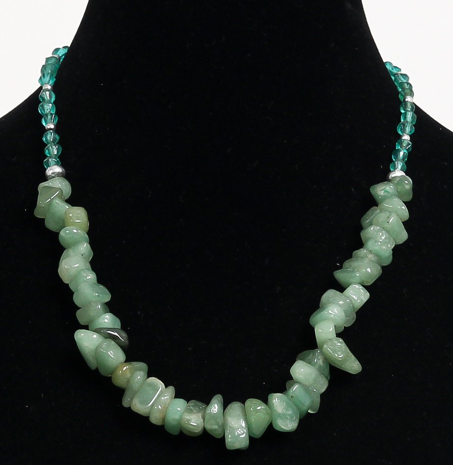 Collier ethnique artisanal imitation petites pierres vertes agrémentées de perles en métal et vertes - REF. 18969 (18.00 €)
