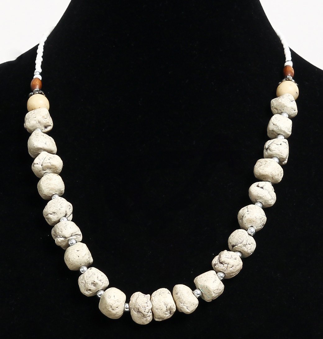 Collier ethnique artisanal imitation pierres blanches difformes séparées de perles en métal et composé de perles blanches - REF. 18950 (14.00 €)