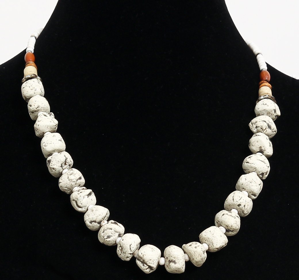 Collier ethnique artisanal imitation pierres blanches difformes séparées de perles en métal et composé de perles blanches - REF. 18950 (14.00 €)