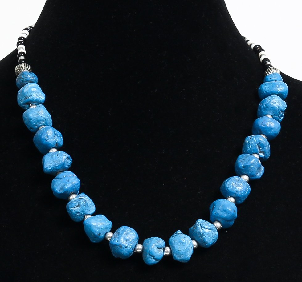 Collier ethnique artisanal imitation boules turquoises difformes séparées de perles en métal et composé d'autres perles noires et blanches - REF. 18942 (14.00 €)