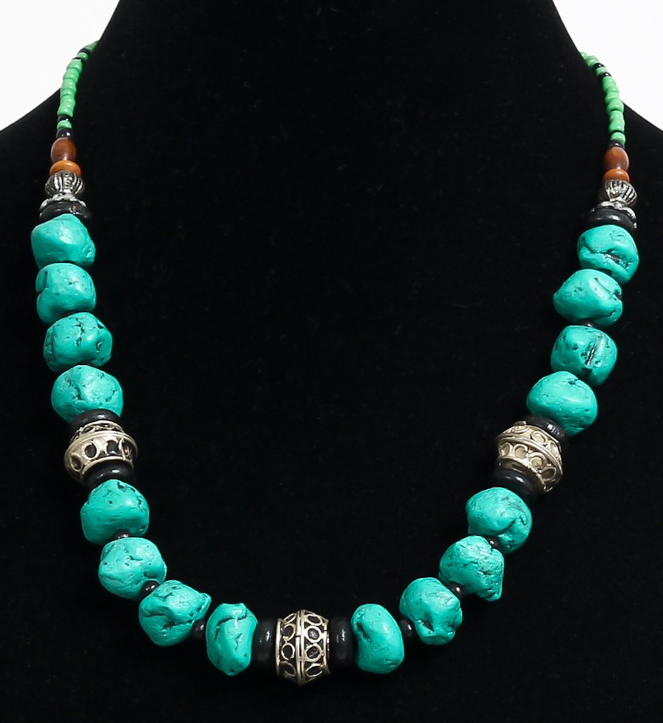 Collier ethnique artisanal imitation boules turquoises difformes séparées de perles en métal et composé d'autres perles noires et blanches - REF. 18942 (14.00 €)