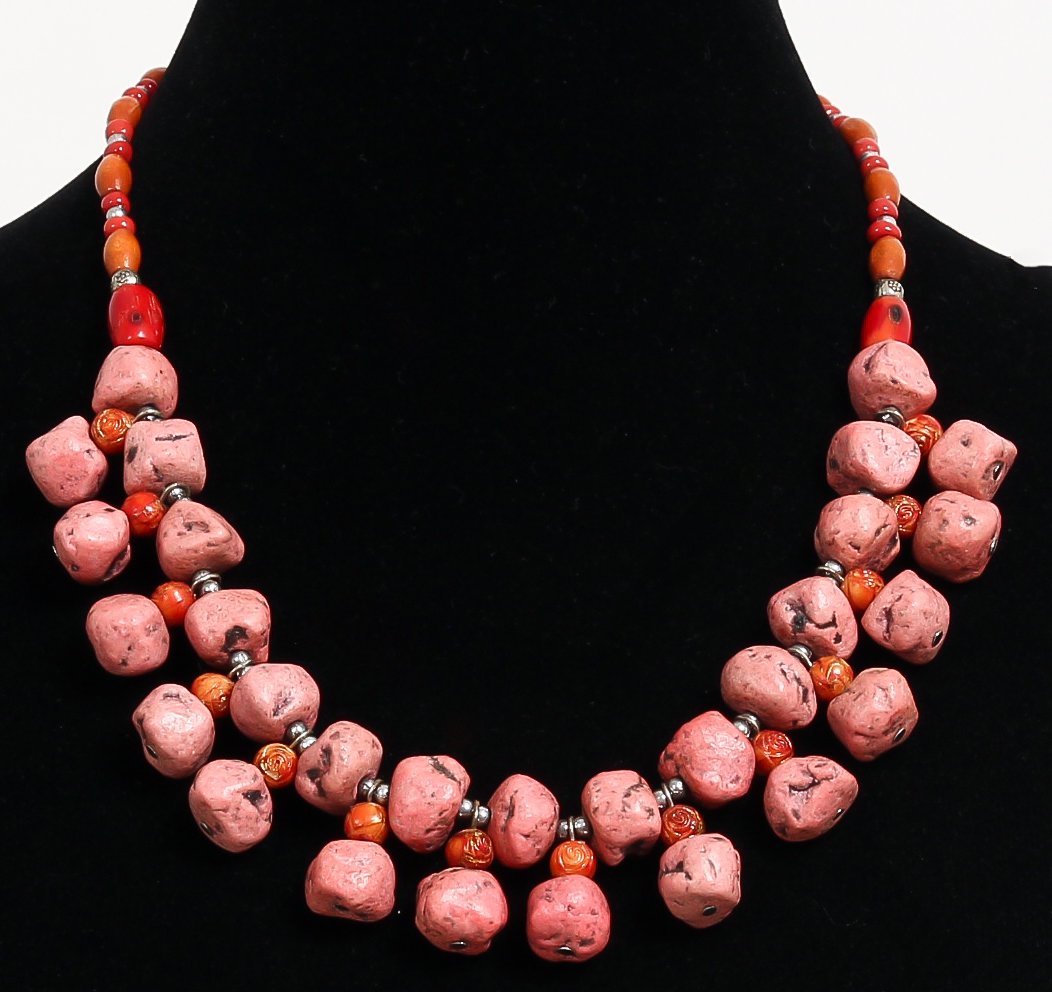 Collier ethnique artisanal imitation pierres corail deux rangs, agrémenté de perles et de métal - REF. 18896 (22.00 €)