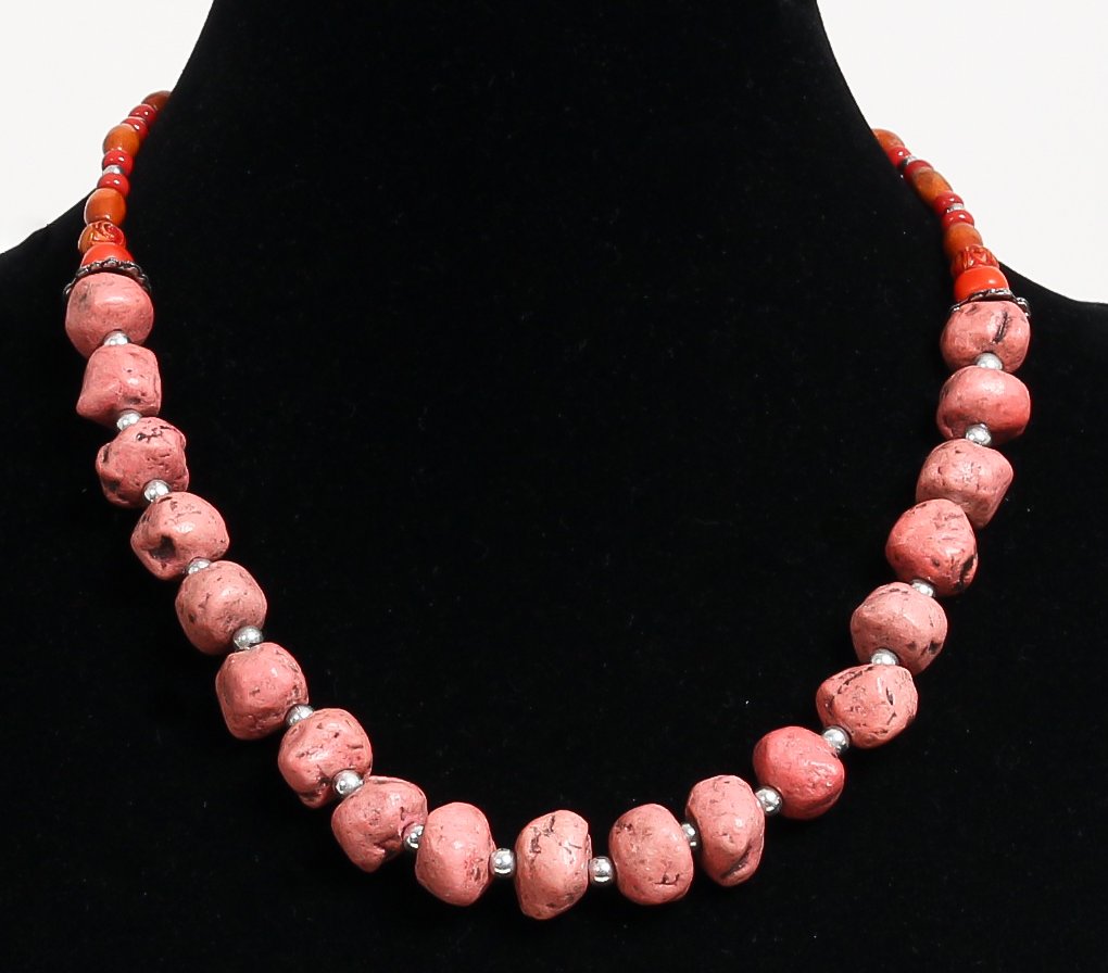 Collier ethnique artisanal imitation boules de corail rose agencées de perles argentées, noires et blanches - REF. 19065 (14.00 €)
