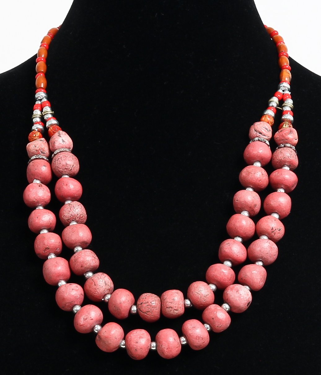 Collier ethnique artisanal imitation pierres corail deux rangs, agremente de perles et de metal