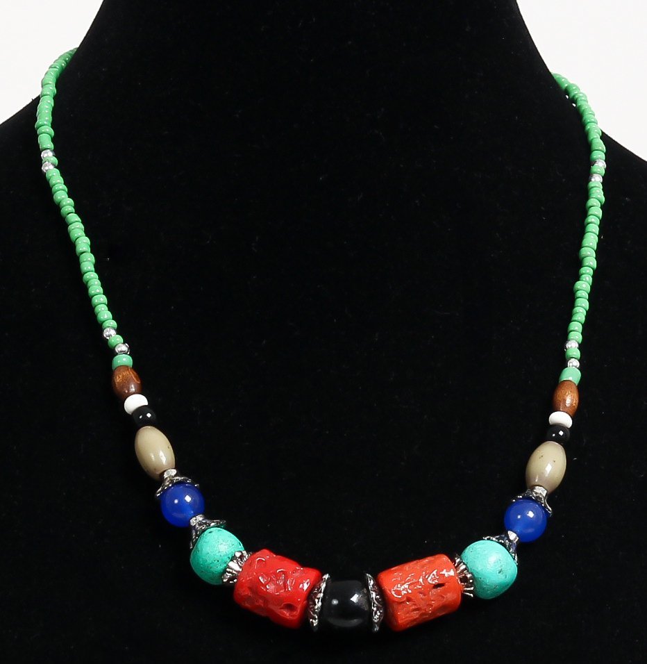 Collier ethnique artisanal imitation pierres cylindrées multicolores agencées de perles vertes et noires - REF. 19083 (22.00 €)