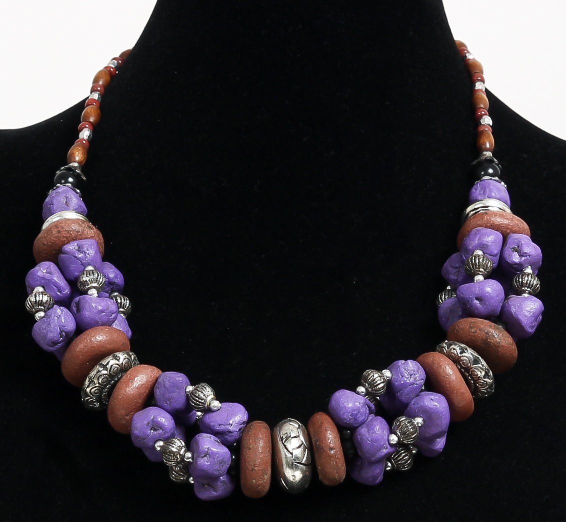 Collier ethnique artisanal imitation pierres marbrées mauves agrémentées de perles argentées, rouges et en bois - REF. 19090 (15.00 €)
