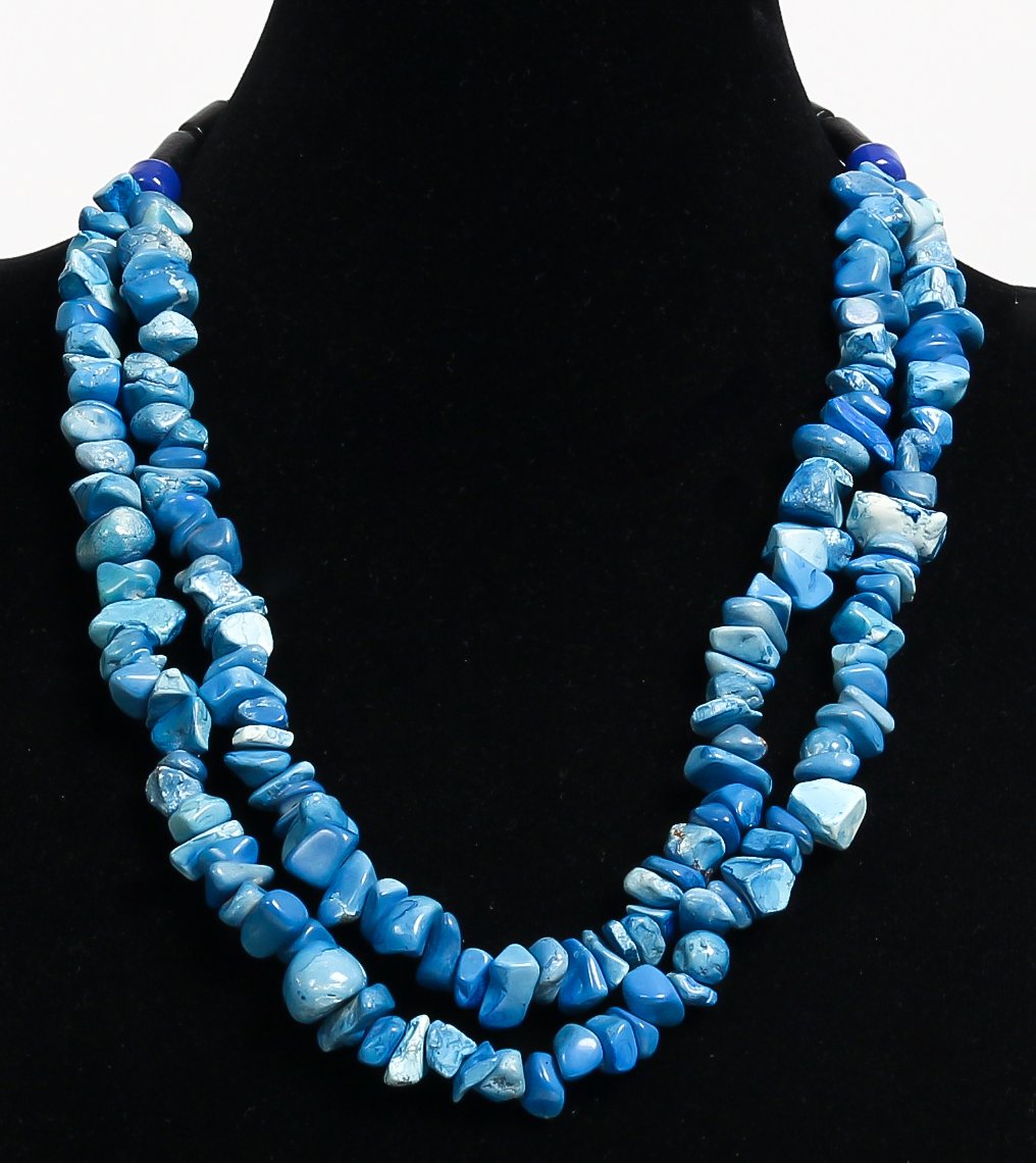 Collier ethnique artisanal imitation quartz bleu deux rangs agremente de tubes noirs