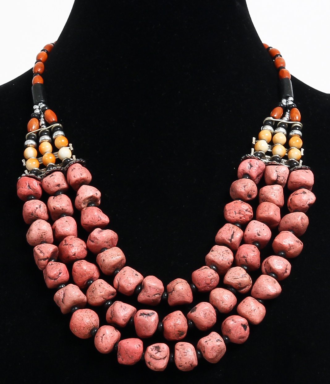 Collier ethnique artisanal trois rangs imitation corail et perles agencées de pièces argentées ciselées Vetement & Accessoire