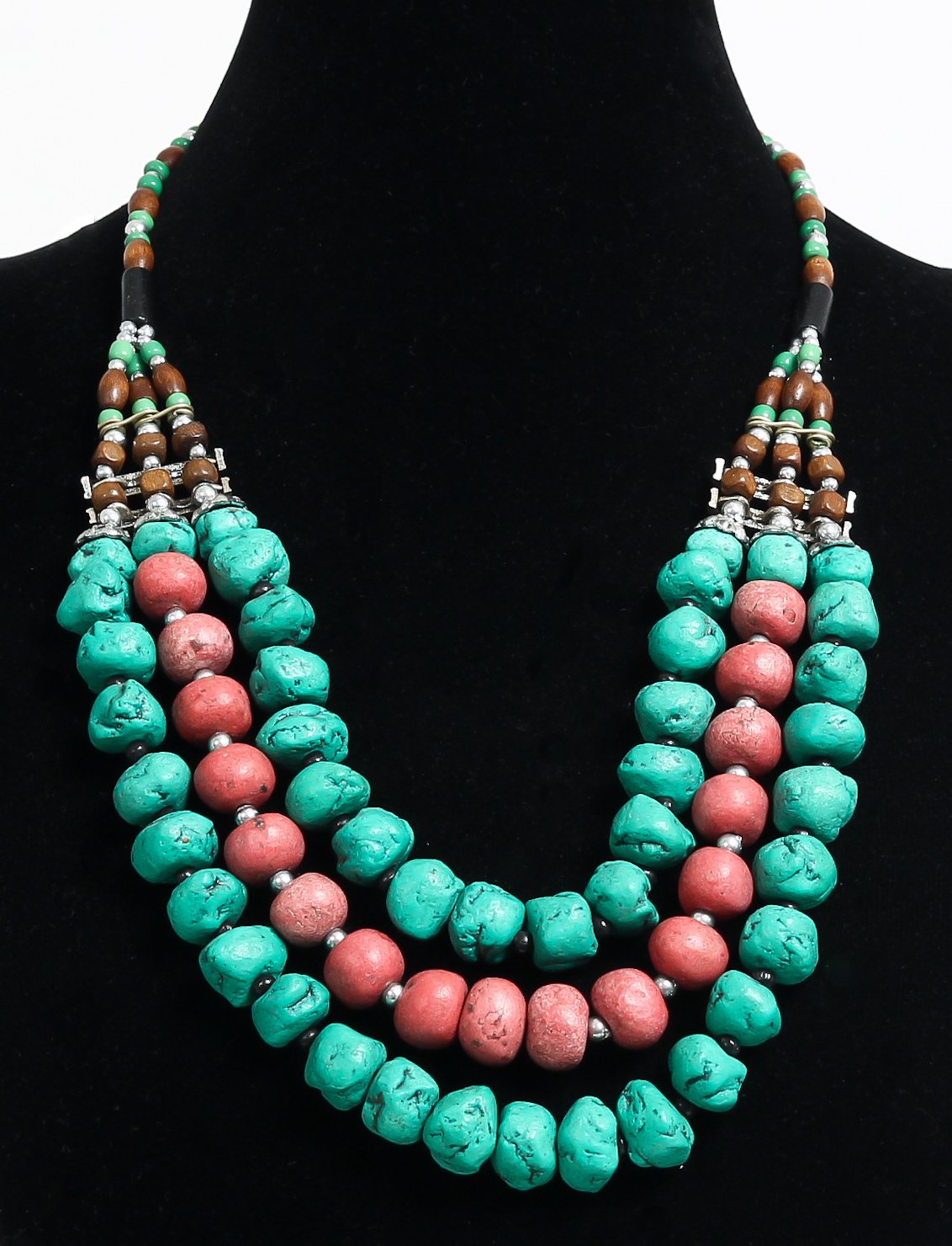 Collier ethnique artisanal trois rangs imitation pierres turquoises et roses agrémentées de perles et d'armatures argentées ciselées Vetement & Accessoire