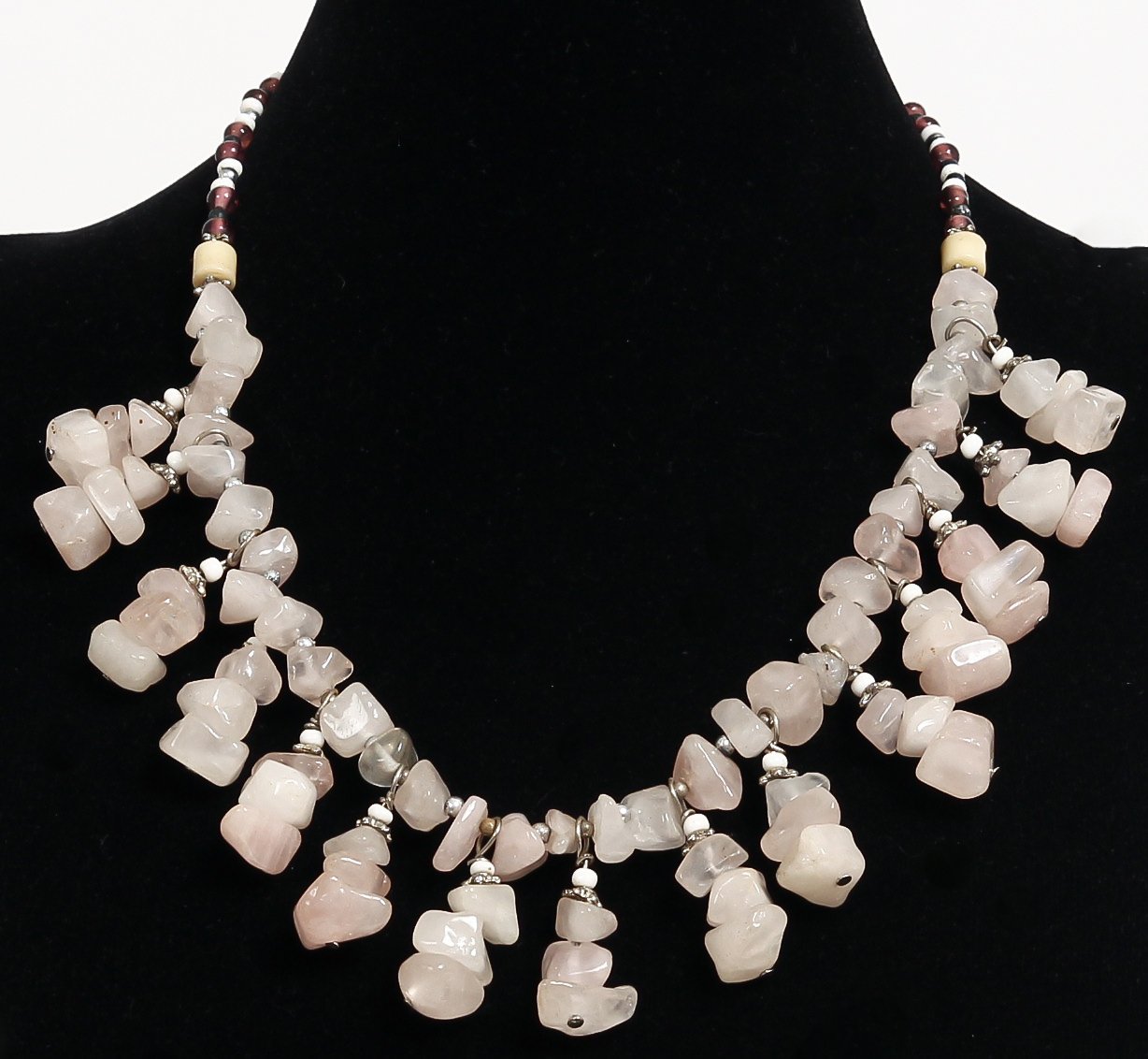 Collier ethnique artisanal imitation boules blanches agrémentées de quartz transparent et marron - REF. 19125 (22.00 €)