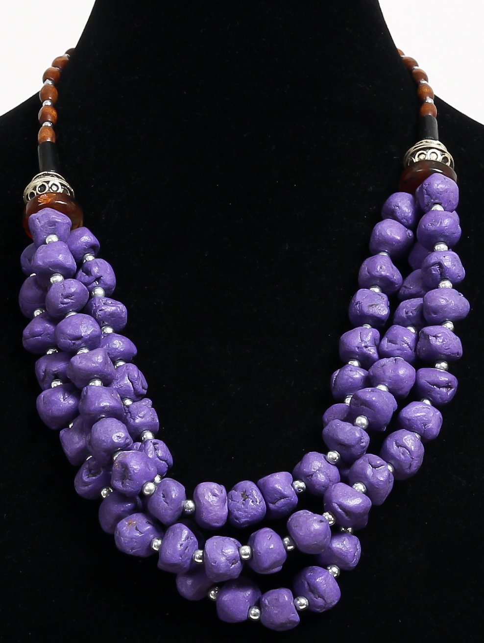 Collier ethniques artisanal imitation pierres mauves trois rangs agrémentées de perles en bois et de breloques argentées Vetement & Accessoire