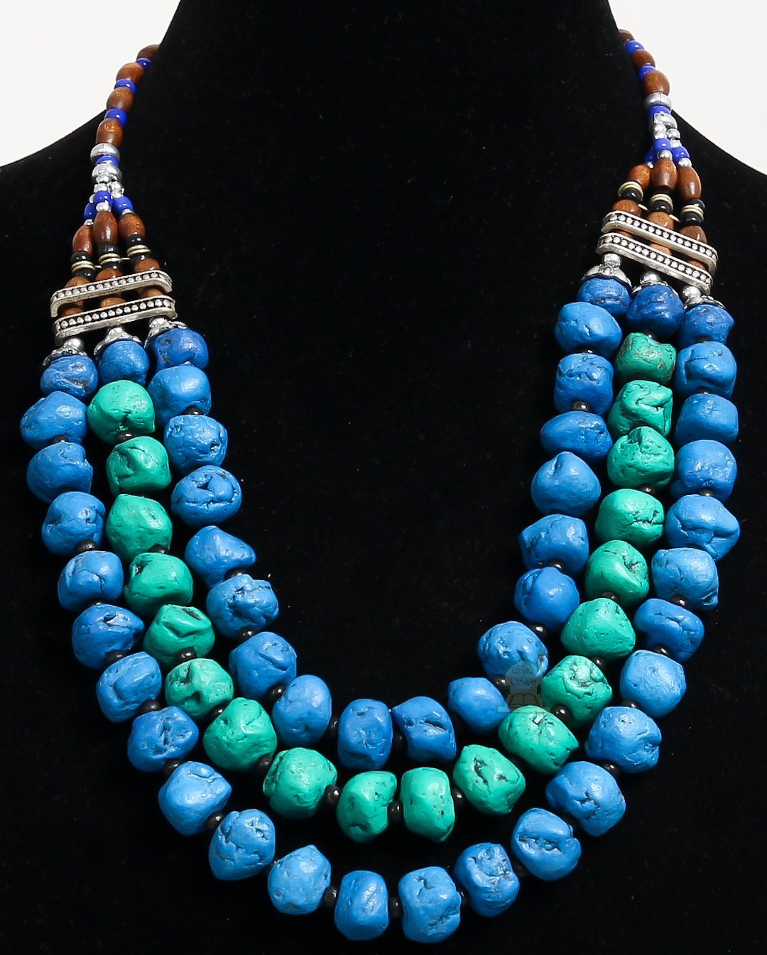 Le collier est composé de deux rangs de pierres bleues (externes) et un rang de pierres turquoises (au milieu), lesquelles sont agencées par des armatures argentées ciselées à une succession de perles bleues et autres en bois (en forme de tube) de façon alterne...