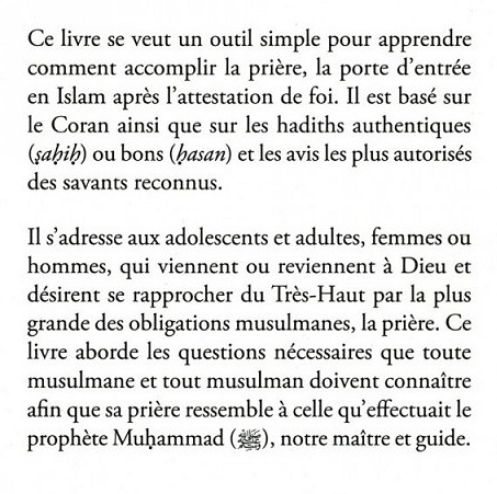 Ce livre est un outil simple pour apprendre comment accomplir la prière, la porte d'entrée en Islam après l'attestation de foi. Il est basé sur le Coran ainsi que sur les hadiths authentiques (sahih) ou bon (hasan) et les avis les plus autorisés des savants reconnus.
