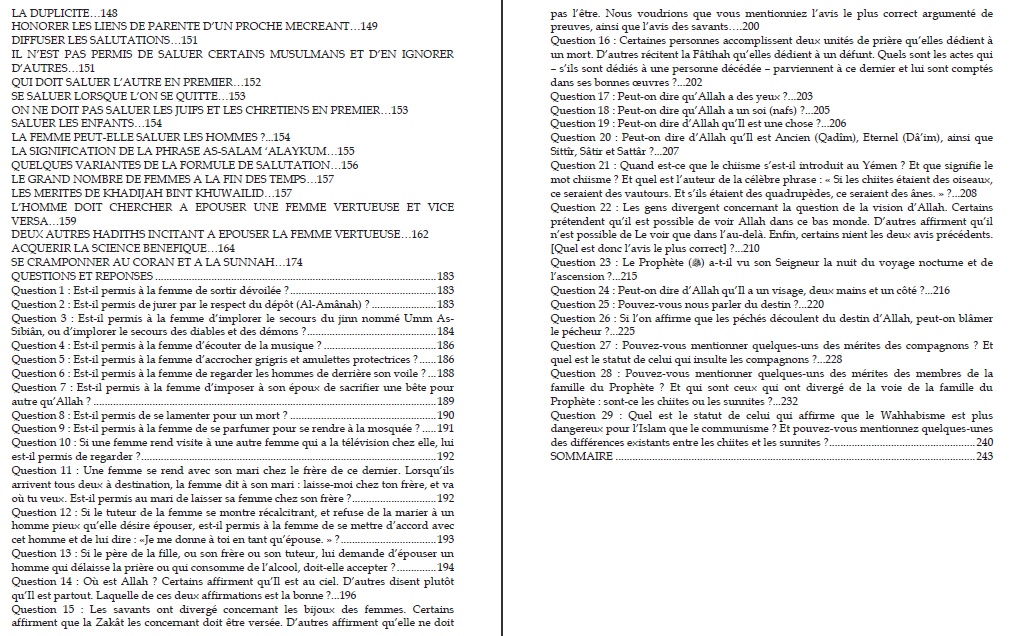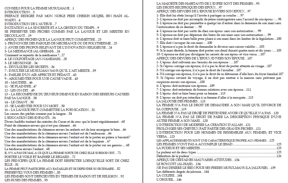 " ... VOICI DONC UN CONSEIL ADRESSE AUX FEMMES SUIVI DE QUESTIONS-REPONSES : Assurément, le devoir de conseil et d'invitation à la religion d'Allah qu'il incombe à la femme envers ses soeurs est important. Et j'espère que ce livre, particulièrement adapté, comblera le manque dans ce domaine. CONCERNANT L'AUTEUR DU LIVRE, il s'agit d'Umm 'AbdAllah Al-Waâdi'iya qui est versée dans beaucoup de sciences et se conforme au comportement du Prophète saw ; C'est une femme méritante, particulièrement soucieuse d'occuper son temps de manière utile, et de faire profiter ses soeurs de sa science. Et c'est la raison pour laquelle Allah a béni la science qu'elle détient. Qu'Allah la récompense en bien, améliore sa situation et fasse de ses enfants des musulmans pieux, il est certes capable de tout." Cheikh Muqbil.