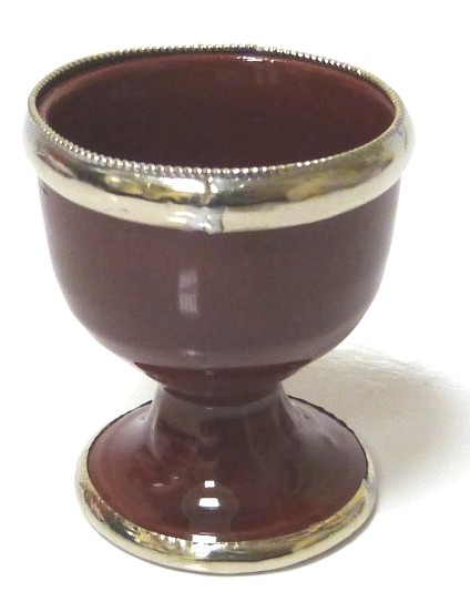 Coquetier artisanal en poterie, en provenance de Marrakech (Maroc), peint en marron, émaillé, et cerclé de métal ornemental argenté, légèrement ciselé.