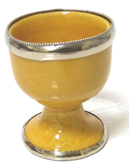 Coquetier artisanal en poterie, en provenance de Marrakech (Maroc), peint en jaune, émaillé, et cerclé de métal ornemental argenté, légèrement ciselé.