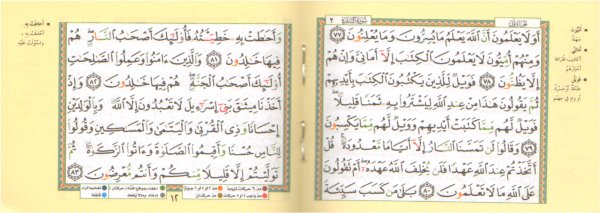 Chaque page de Coran est présentée sur deux pages afin d'agrandir la taille des caractères.