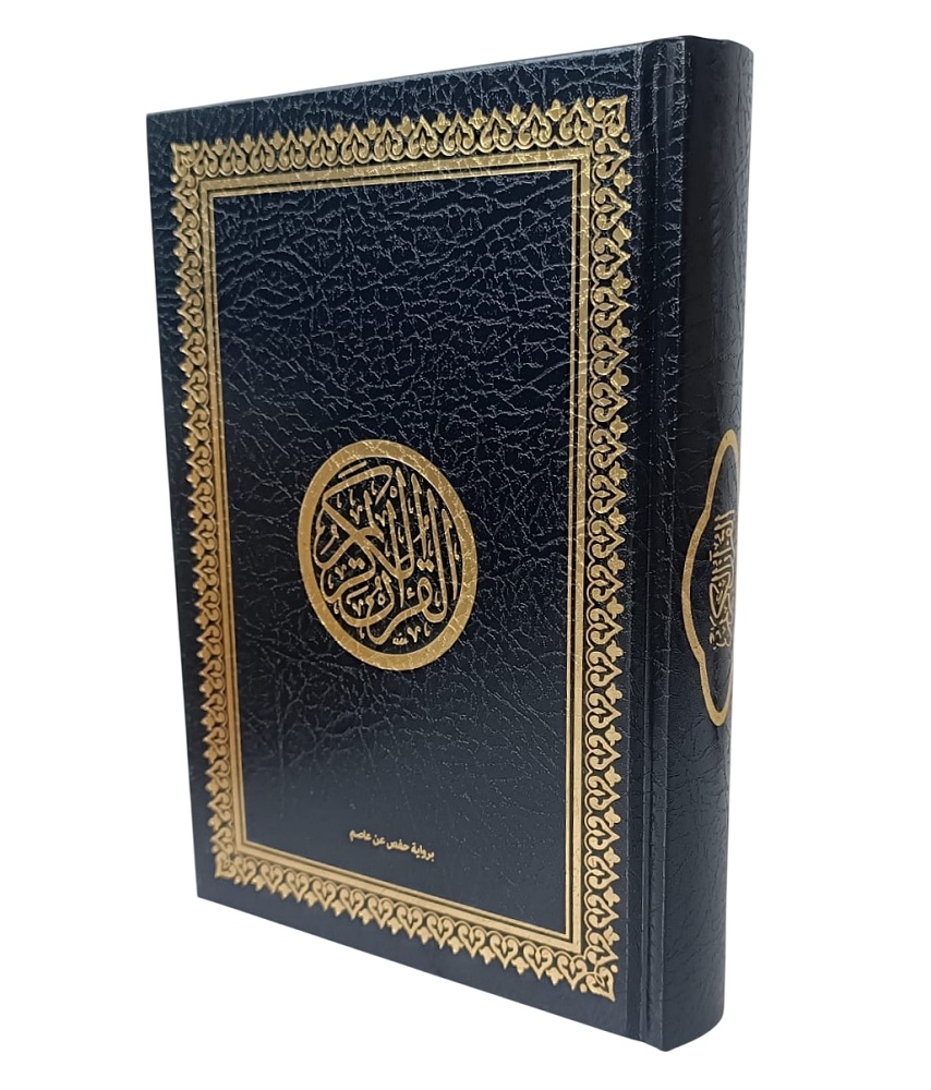 Très beau Coran, selon l'école de récitation "Hafs" (رواية حفص), avec couverture en simili cuir de luxe noir et décorations dorées (moujjalad), papier chamois et impression en noir + une couleur, et doté d'un ruban marque page.