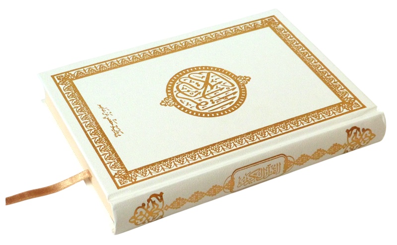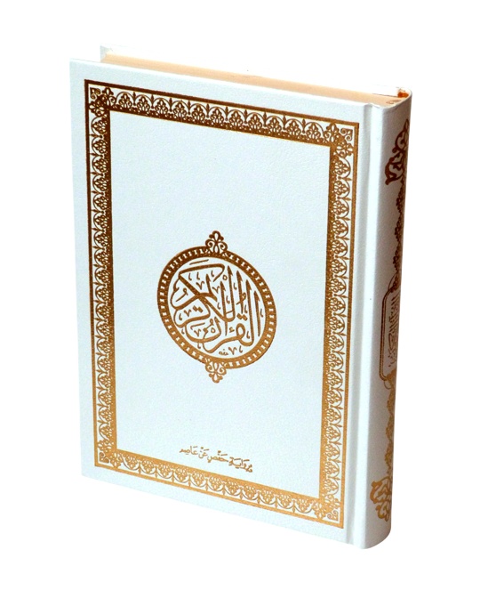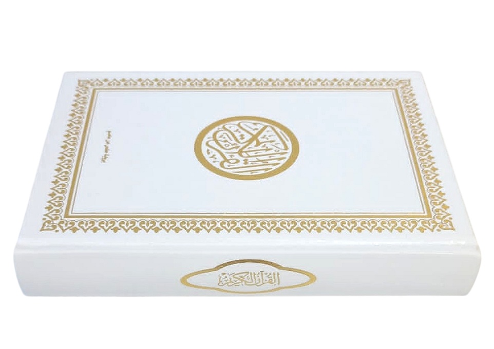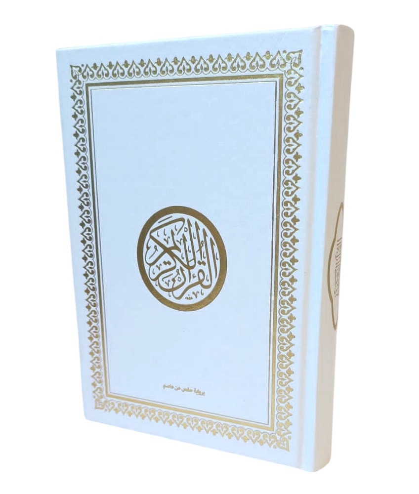 Très beau Coran en langue arabe (Lecture Hafs) avec couverture en simili cuir blanc et décorations dorées, papier chamois et impression en noir + une couleur, et doté d'un ruban marque page en soie.
