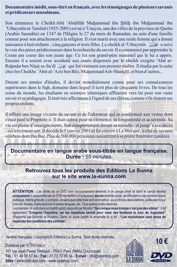 Son éminence le Cheikh Abû ‘Abdillâh Muhammad ibn Sâlih ibn Muhammad ibn ‘Uthaymîn at-Tamîmî (1925-2001) est né à ‘Unayza, une des villes de la province al-Qasîm (Arabie Saoudite) en 1347 de l'Hégire le 27 du mois de Ramadan, au sein d'une famille connue pour son attachement à la religion. Il s'est marié avec une seule femme qui a donné naissance à huit enfants ; cinq garçons et trois filles. Le cheikh al-‘Uthaymîn a suivi la voie des pieux prédécesseurs dans la recherche du savoir. Il a commencé par apprendre le Coran par coeur dès son jeune âge. Ce fut son grand-père maternel qui le lui a appris. Ensuite il a assisté avec assiduité aux cours dispensés par le cheikh exégète ‘Abd ar-Rahmân ben Nâsir as-Sa‘dî qui fut vraiment son premier maître. Il étudia par la suite chez les Cheikhs ‘Abd-al-‘Azîz ben Bâz, Muhammad Ash-Shanqîtî, et bien d’autres...