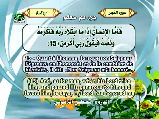 DVD Le Saint Coran apprentissage pour enfants - Le Cheikh avec les enfants qui répètent avec traduction française et anglaise (affichée à l'écran en parallèle avec l'arabe).