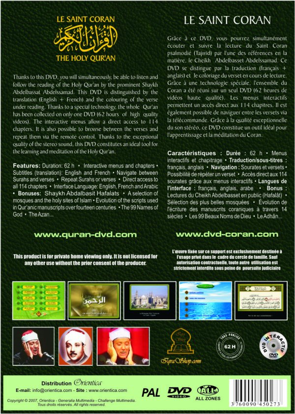 Features: Duration: 62 h • Interactive menus and chapters • Subtitles (translation): English and French • Navigate between Surahs and verses • Repeat Surahs or verses • Direct access to all 114 chapters • Interface Language: English, French and Arabic • Bonuses: Shaykh Abdalbasit Hafalats • A selection of mosques and the holy sites of Islam • Evolution of the scripts used in Qur’anic manuscripts over fourteen centuries • The 99 Names of God • The Azan...