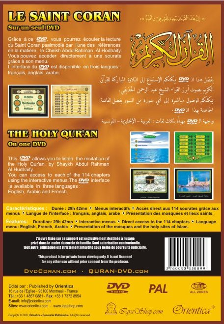 Grâce à ce DVD, vous pourrez écouter la lecture du Saint Coran psalmodié par l'une des références en la matière, le Cheikh AbdulRahman Al Hodhaify. Vous pouvez accéder directement à une sourate grâce à son menu. L'interface du DVD est disponible en trois langues : français, anglais, arabe.