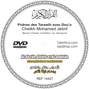 Prières des Tarawîh avec Dou’a - Cheikh Mohammed JebrilSous-titrage intégral en françaisMuhammad-Muhammad Al Said Hussayn Jebril, connu dans le monde musulman sous le nom de « Cheikh Jebril » est licencié de droit musulman de l'Université d'Al Azhar. Il a appris le Coran à l’âge de 9 ans. Plus d'une fois, Cheikh Jebril a gagné les concours égyptiens et internationaux de récitation du Coran. Il a été nommé Imam de la célèbre mosquée 'Amr Ibn Al'Ass du Caire en 1988. Chaque année, vers cette mosquée afflue des dizaines de milliers de personnes durant le mois de Ramadan pour assister aux prières de Tarawîh qu’il préside. Cheikh Muhammad Jebril est également professeur à l'université de Jordanie. Il a à son actif plusieurs récitations complètes du Coran. Il a participé et organisé de nombreuses émissions télévisées dans plusieurs chaînes du monde arabe autour des thèmes coraniques. Enfin, Cheikh Jebril est particulièrement apprécié pour la qualité de ses “Dou'as Al Qunût” (invocations faites durant la prière).Ce DVD contient l'enregistrement vidéo des prières de Tarawîh faites à la mosquée ‘Amr Ibn Al-'Ass durant le mois de Ramadan 2005. Les sourates psalmodiées sont : Al-Ahzâb, Ghâfir et Al-Dukhân et invocation de fin de récitation du Saint Coran (Dou’a Khatm Al Qur’ân).