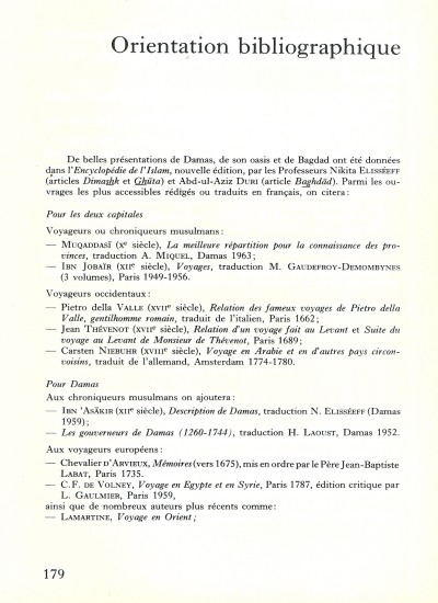 Jacques Dumarçay, ancien ambassadeur de France, en quelques pages (1-8) intitulées « Capitales et terres des califes », présente l’ouvrage composé en forme de diptyque, Le premier volet, ou chapitre (p. 11-86), est consacré à Damas et à son passé; un historique de la capitale syrienne (p. 11-33) seft d’introduction à une série de soixante illustrations (p. 35-75). Ces illustrations sont suivies de brèves notices de commentaire (p. 76-83), enfin un plan schématique de Damas (p. 84-85) permet de situer les monuments. Dans le second volet, qui traite des monuments de Bagdad (p. 87-172), cinquante-sept photographies (p. 109-157), suivies de leurs notices (p. 158-167), illustrent le bref aperçu historique de la capitale de l’Irak par lequel l’auteur commence ce chapitre (p. 87-108), qui s’achève par deux plans schématiques de Bagdad (p. 168). Avant de terminer son ouvrage par une rapide orientation bibliographique (p. 179-180), M. de Maussion de Favières nous donne une table des a. concordances » chronologiques (p. 173-178) concernant la « Région de Damas et Syrie méridionale » et la « Région de Bagdad et Basse Mésopotamie » depuis le Ve millénaire jusqu’à nos jours.