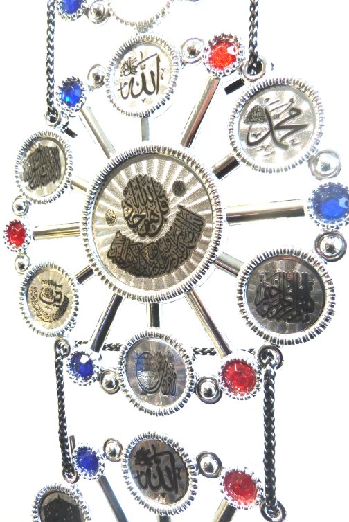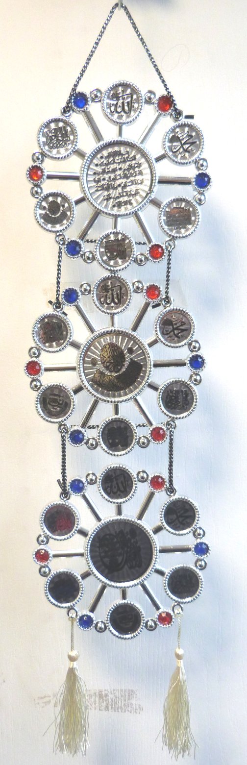 Pendentif moderne argenté, il s'accroche au mur pour agrémenter la décoration de votre maison. Une inscription calligraphique orne chacune des trois parties qui le constituent : "AL FATIHA" sur la partie haute, "AL IKHLASS" au milieu et "AL FALAQ" sur la partie basse. Ainsi que d'autres inscriptions tout autour des sphères. Il a tout pour plaire !