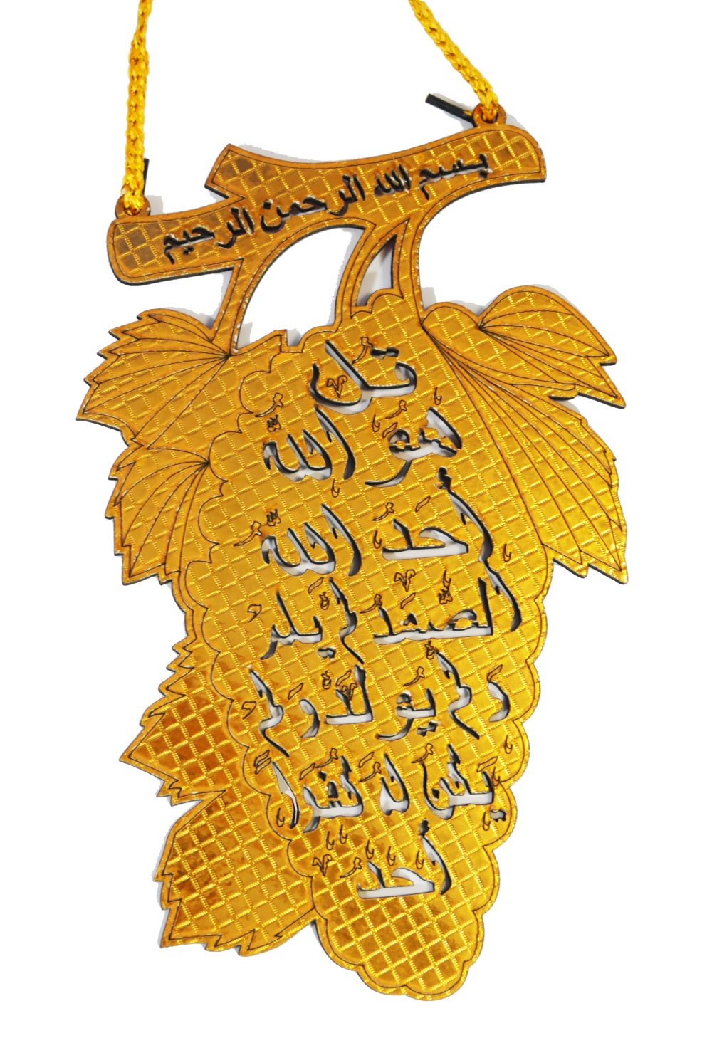 Jolie décoration islamique avec inscription calligraphique du Coran : Sourate "Al-Ikhlas". Fourni avec sa corde dorée pour la susprendre.