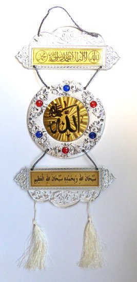 Décoration à suspendre dorée et argentée avec des inscriptions calligraphiques islamiques et le Nom "ALLAH" calligraphié dans la partie centrale.