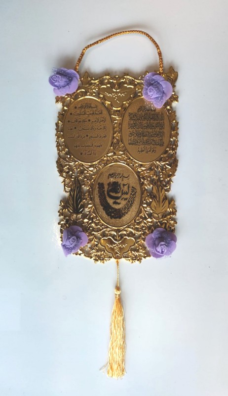 Décoration islamique à suspendre dorée contenant des versets et sourates coraniques. La Fâtiha, Le Verset du Trône et le début du Yâ-Sîn...