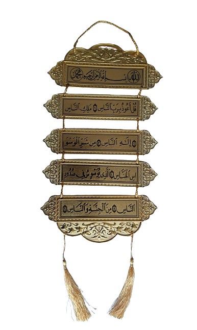 Pendentif dé déco coranique doré avec pompons au bout, contenant la Sourate An-Nâs à connaître par cœur et à réciter quotidiennement pour se protéger de tout mal.