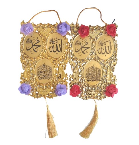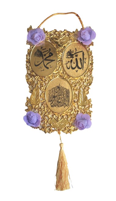 Décoration islamique murale dorée contenant les nom d'Allah, Mohammad (saw) et la chahada (tawhid).